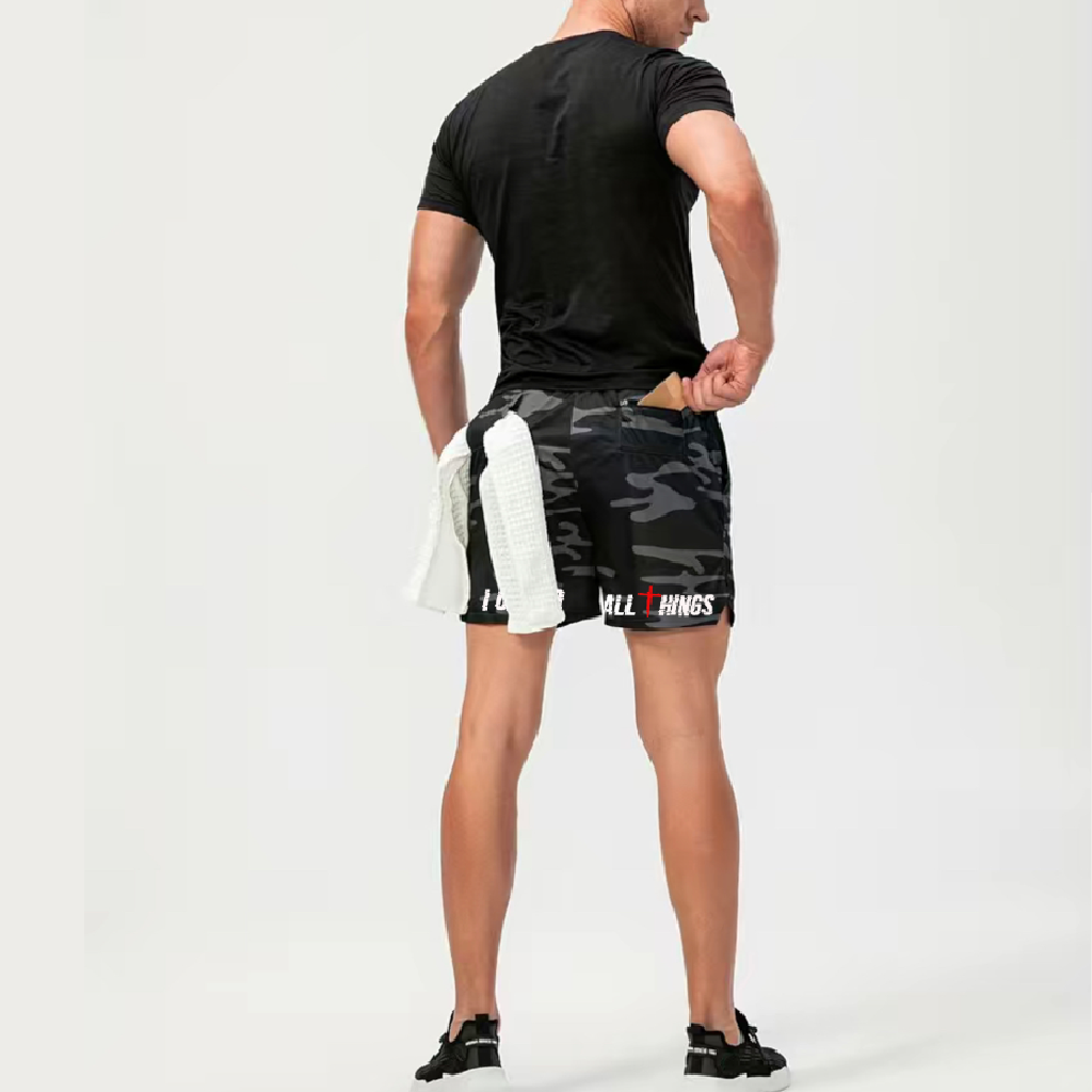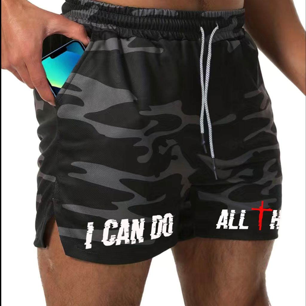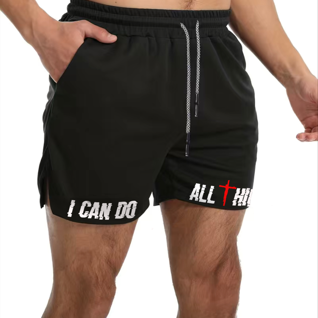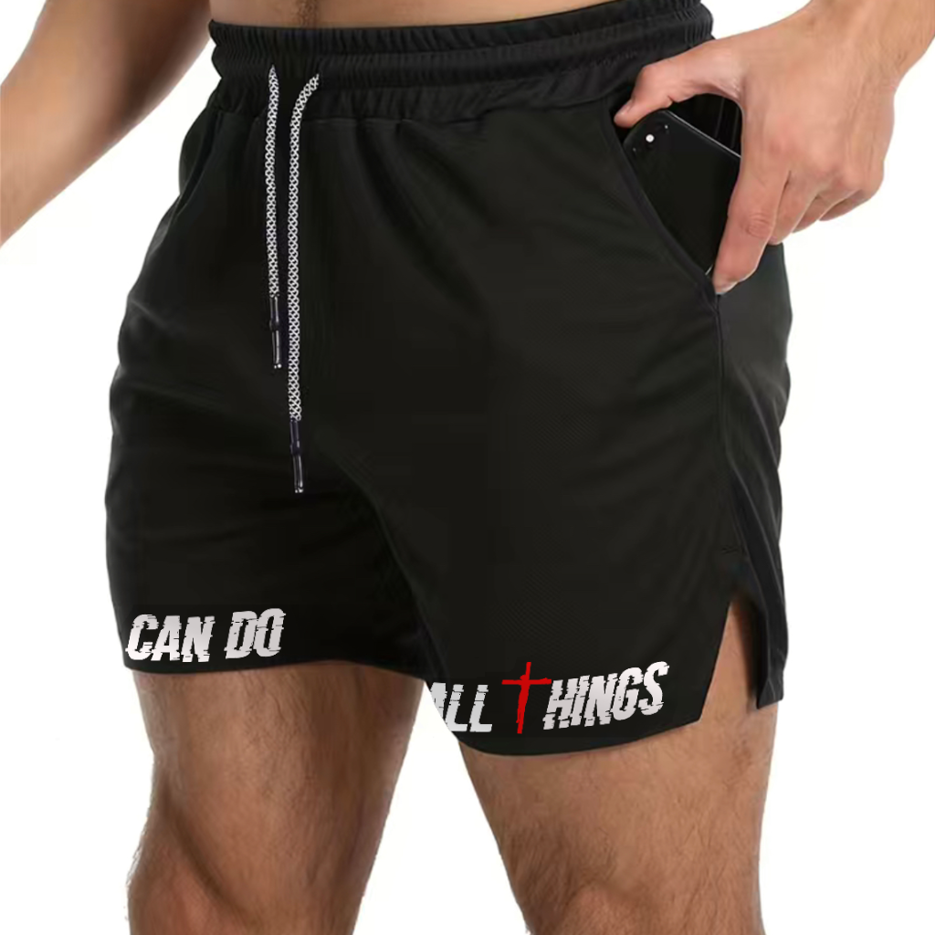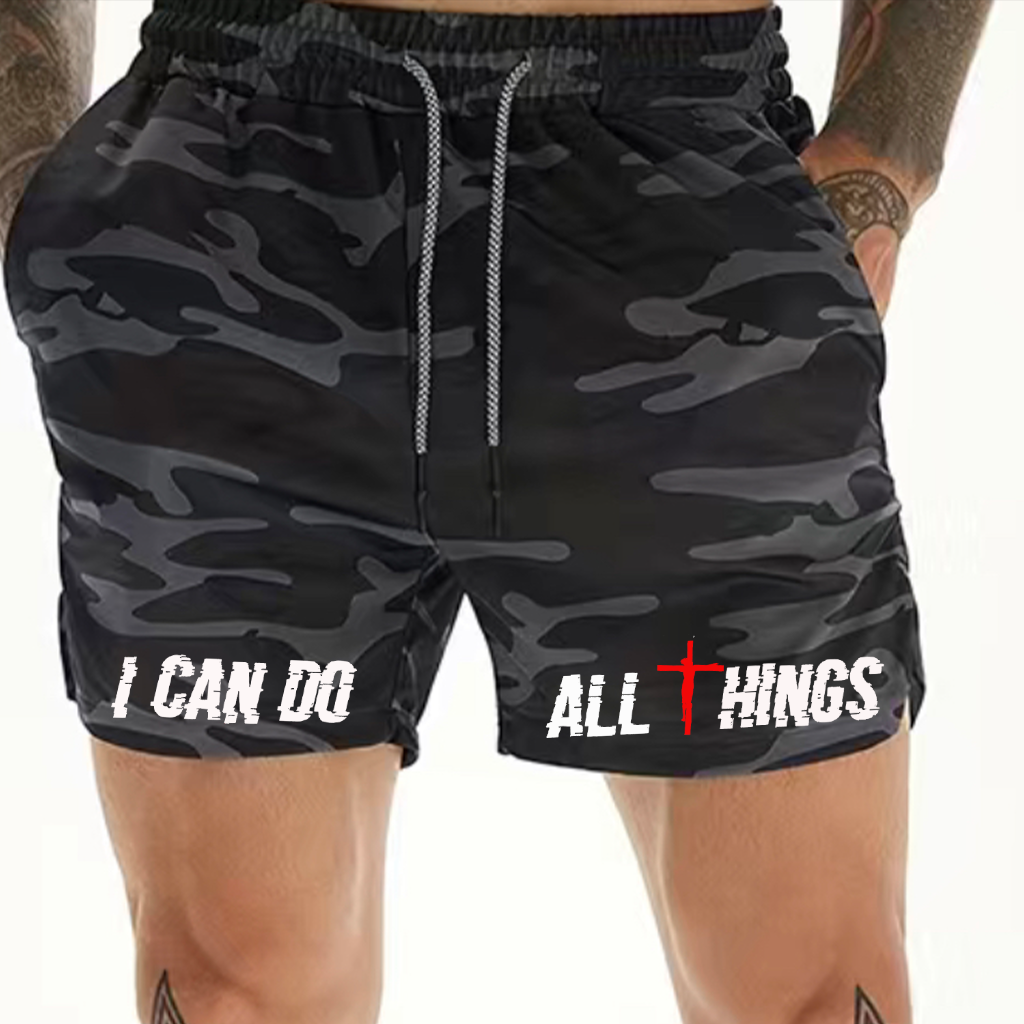Bold eye catching printed scripture, I CAN DO ALL THINGS on front and back of shorts!
