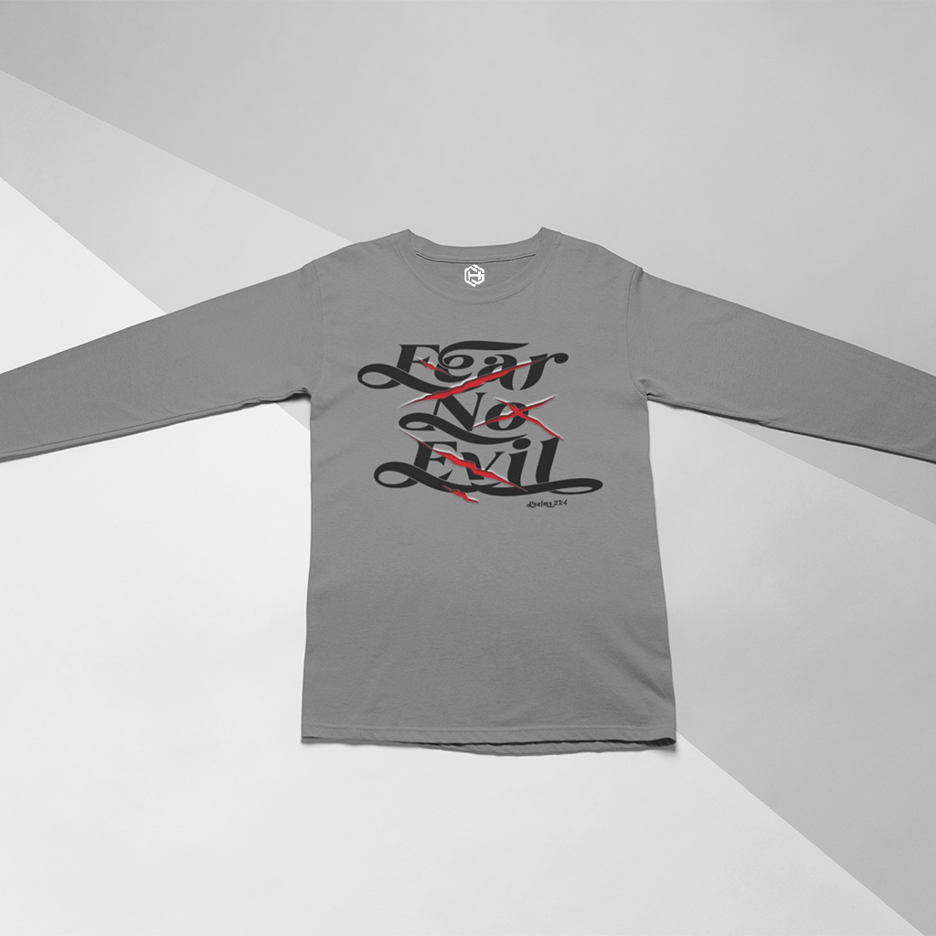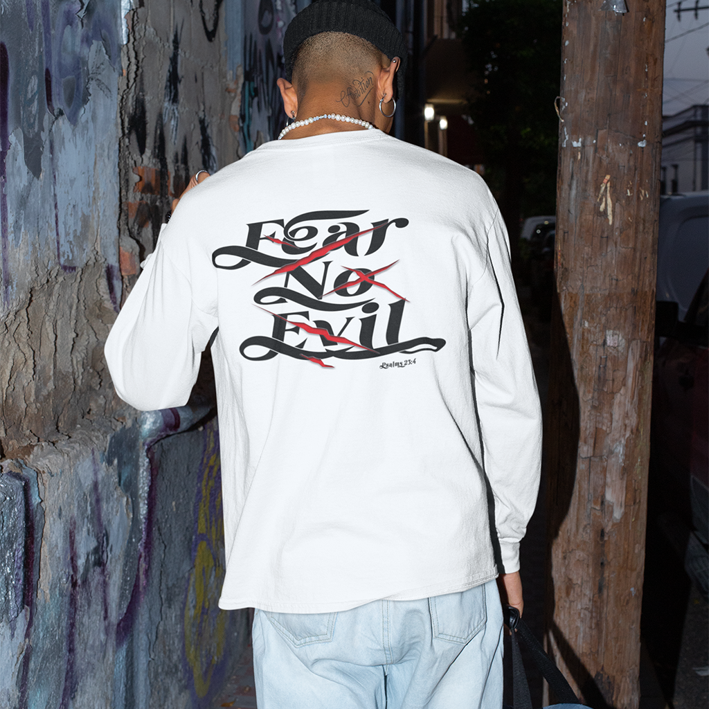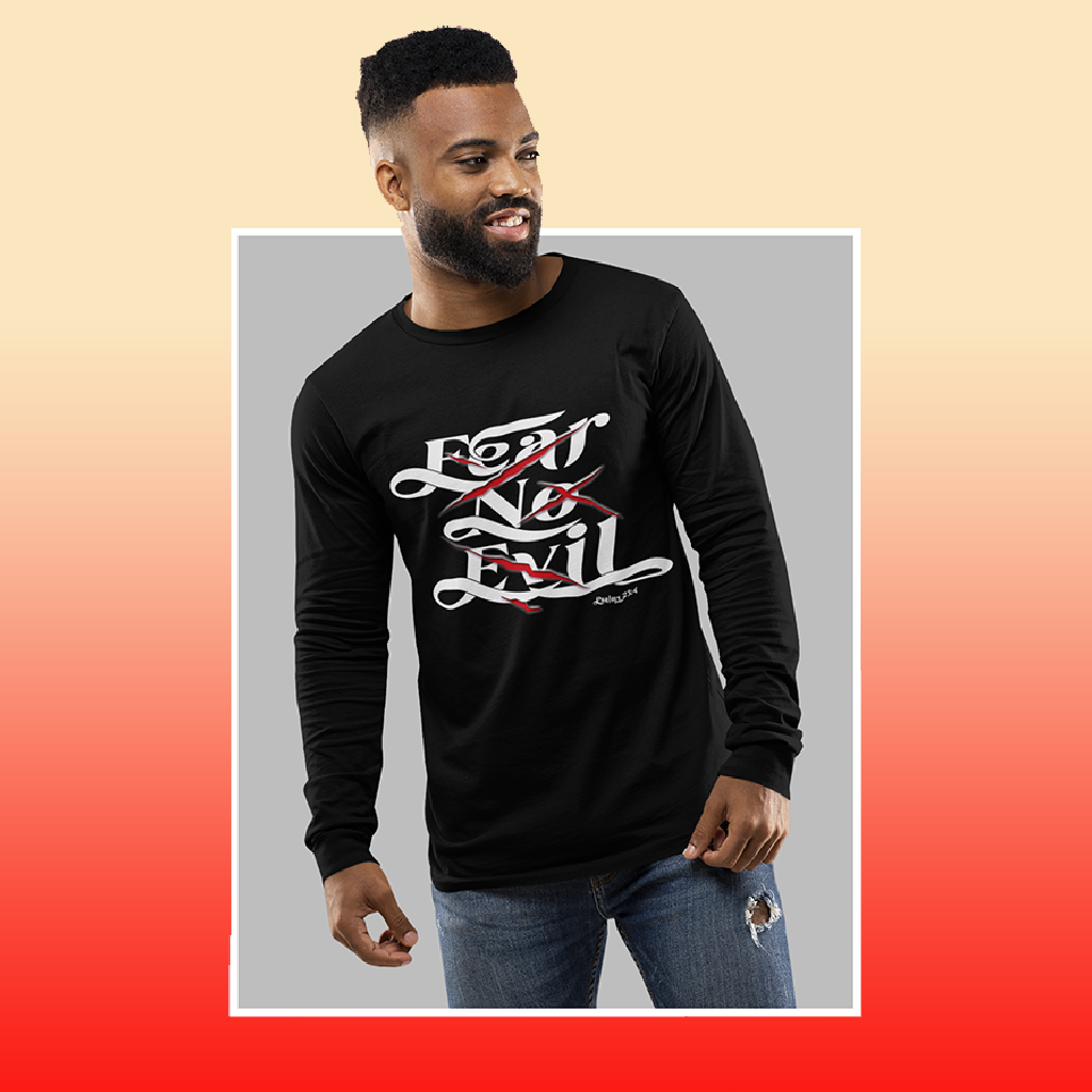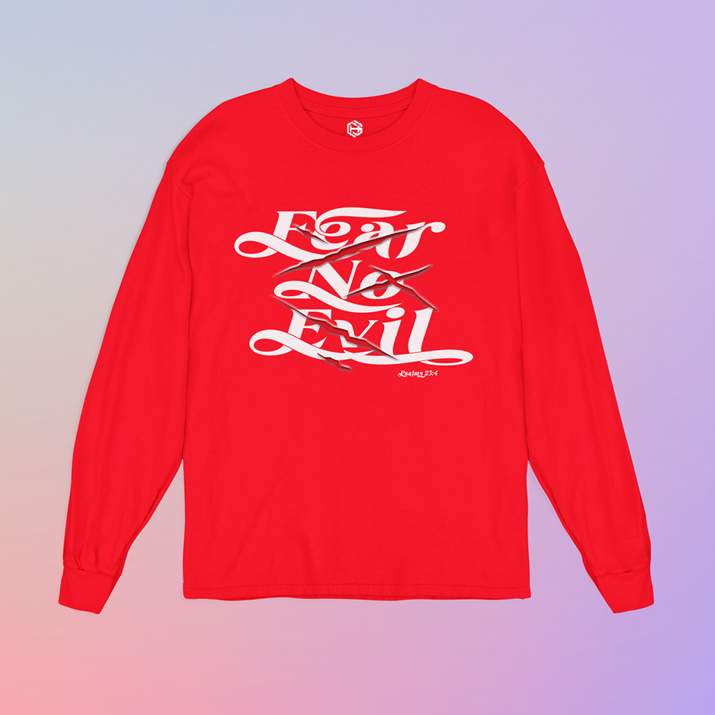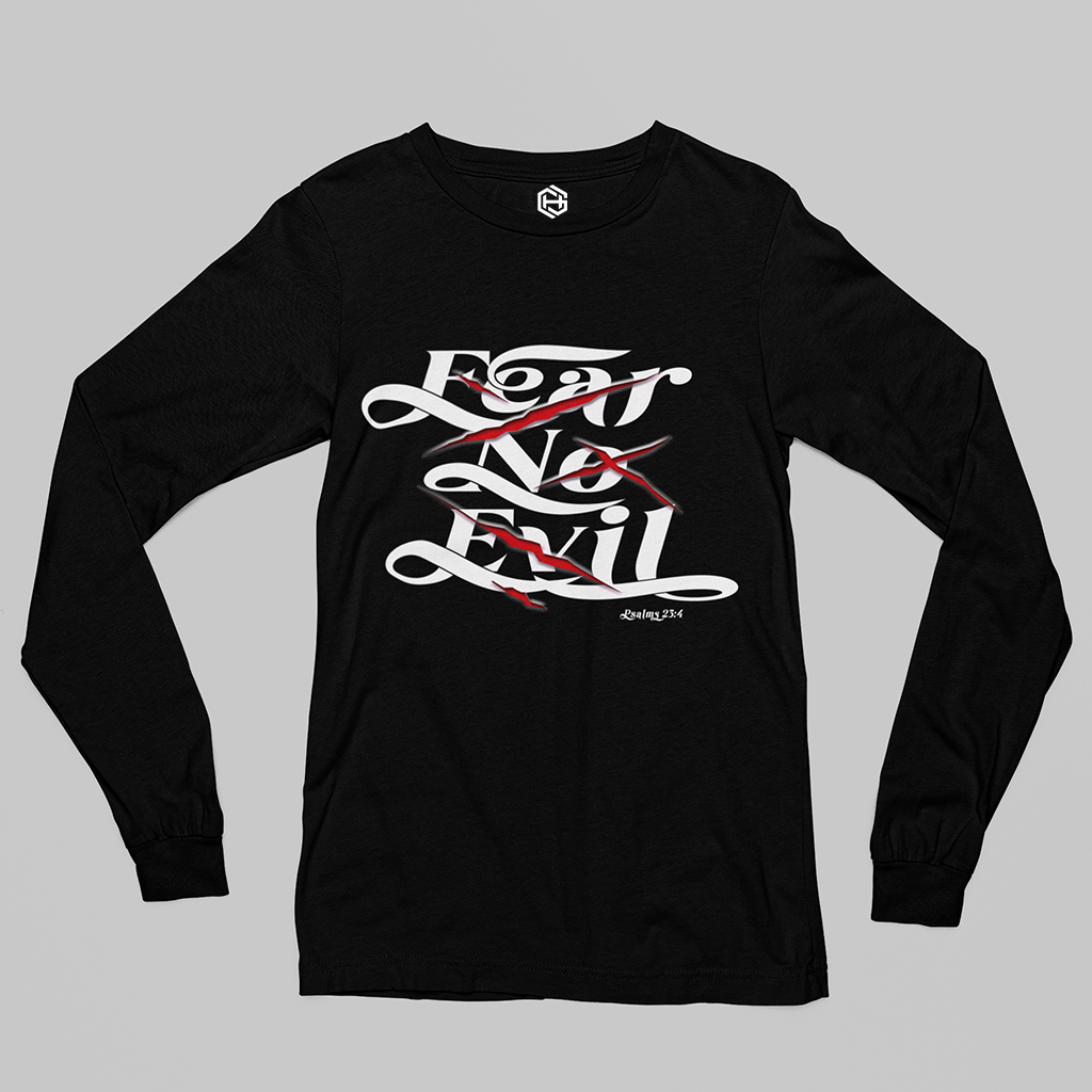Get your "Fear No Evil" Long sleeve shirt today! With God we are called to walk fearless! Based on the scripture Psalms 23:4 "Yea, though I walk through the valley of the shadow of death, I will fear no evil: for thou art with me; thy rod and thy staff they comfort me."