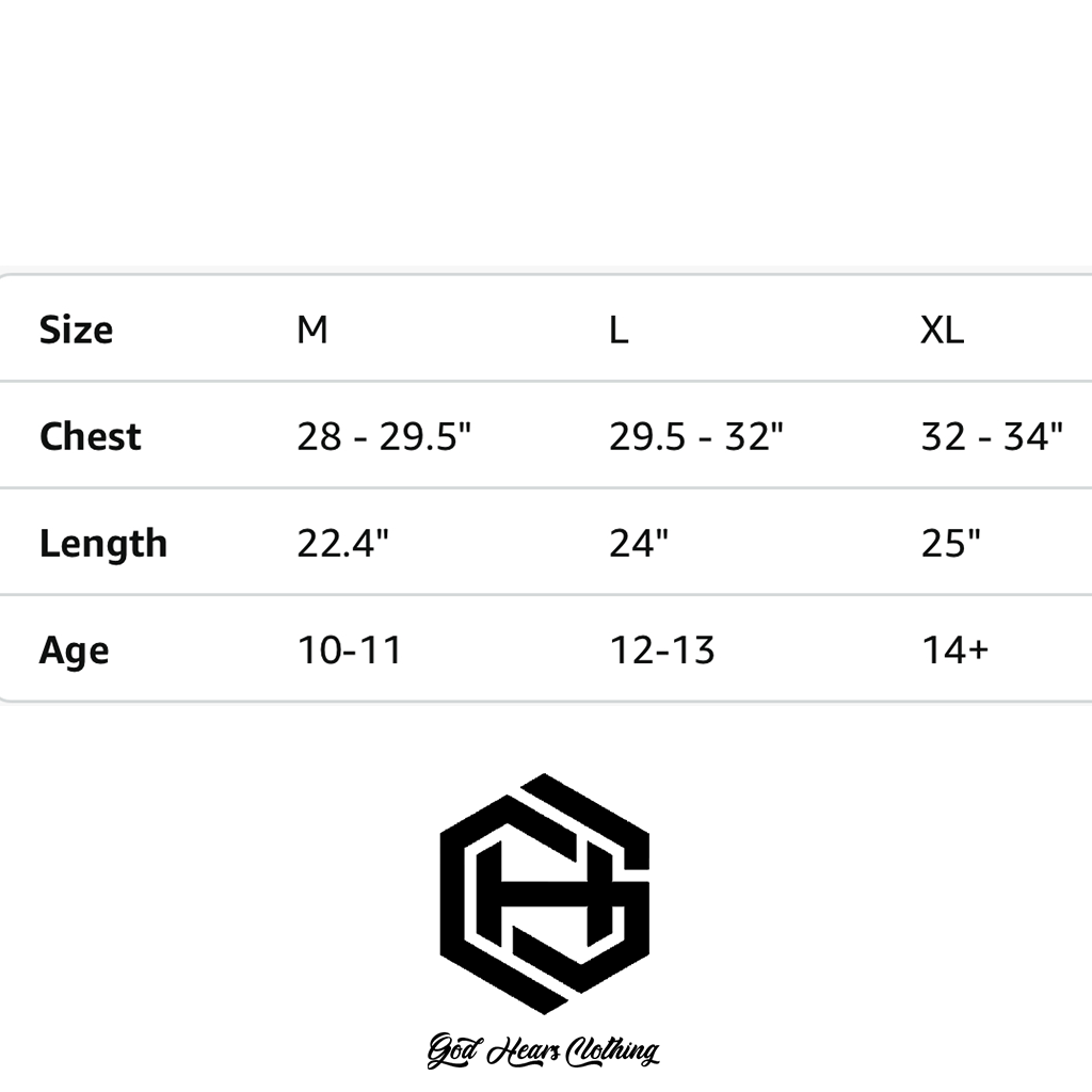 Sizing Information: Due to natural variations in body composition, please reference our size chart as a general guideline. God Hears Clothing implements a consistent "true to size" measurement standard for this product. We recommend selecting your regular size, as our garments are designed to align with standard industry dimensions. This approach typically yields the most satisfactory fit for most customers.